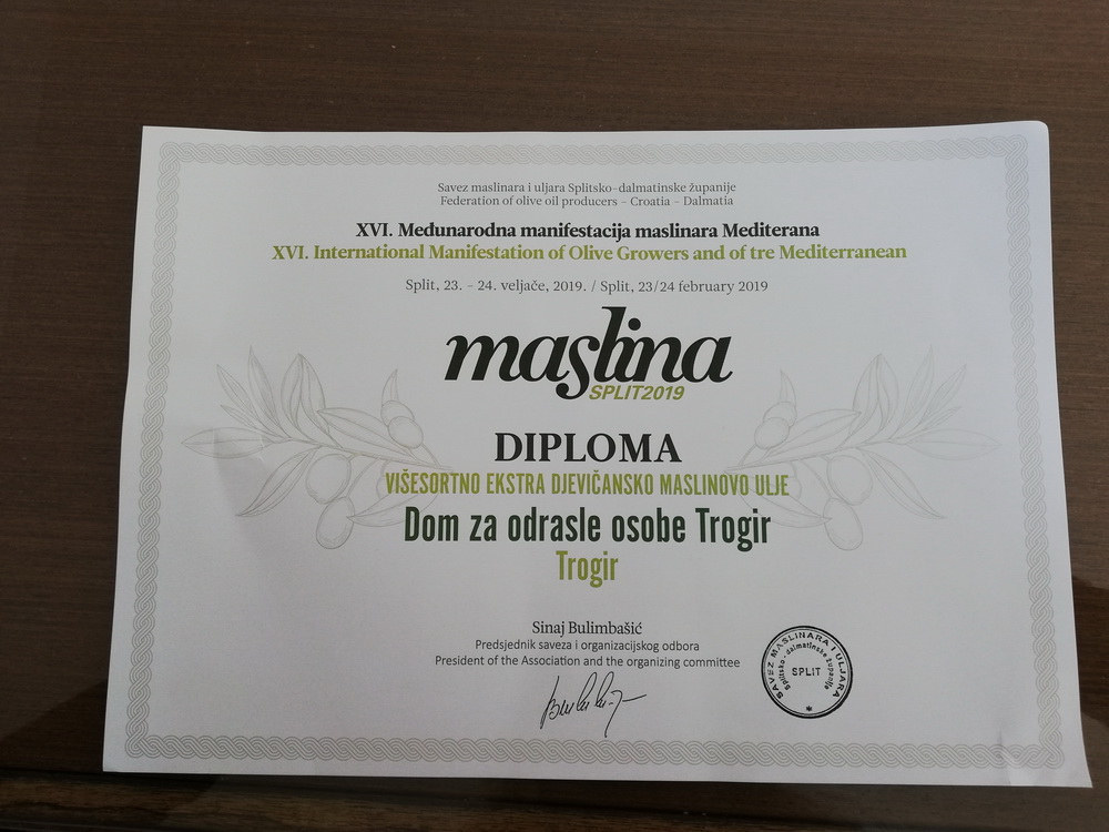 Dom za odrasle osobe Trogir je osvojio diplomu za višesortno ekstra djevičansko maslinovo ulje na 16. međunarodnoj manifestaciji maslinara Mediterana koja se održala u Splitu. Ovo priznanje je još jedna potvrda kvalitete maslinovog ulja koje se već godinama proizvodi u Domu za odrasle osobe Trogir.
